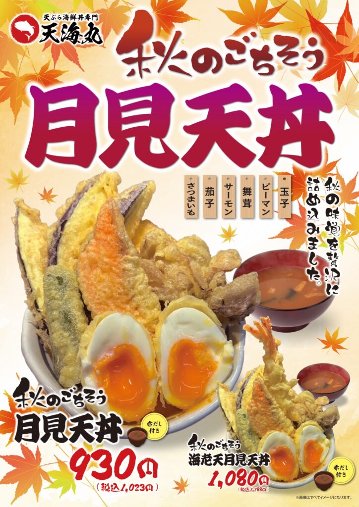 秋の数量限定限定【月見天丼】サクサク天ぷらと、とろ〜り卵天が主役の【月見天丼】。卵黄が天ぷらやご飯に絡み、まろやかさと旨みが口いっぱいに広がります。見た目も華やかで、食欲をそそる贅沢な一杯です。